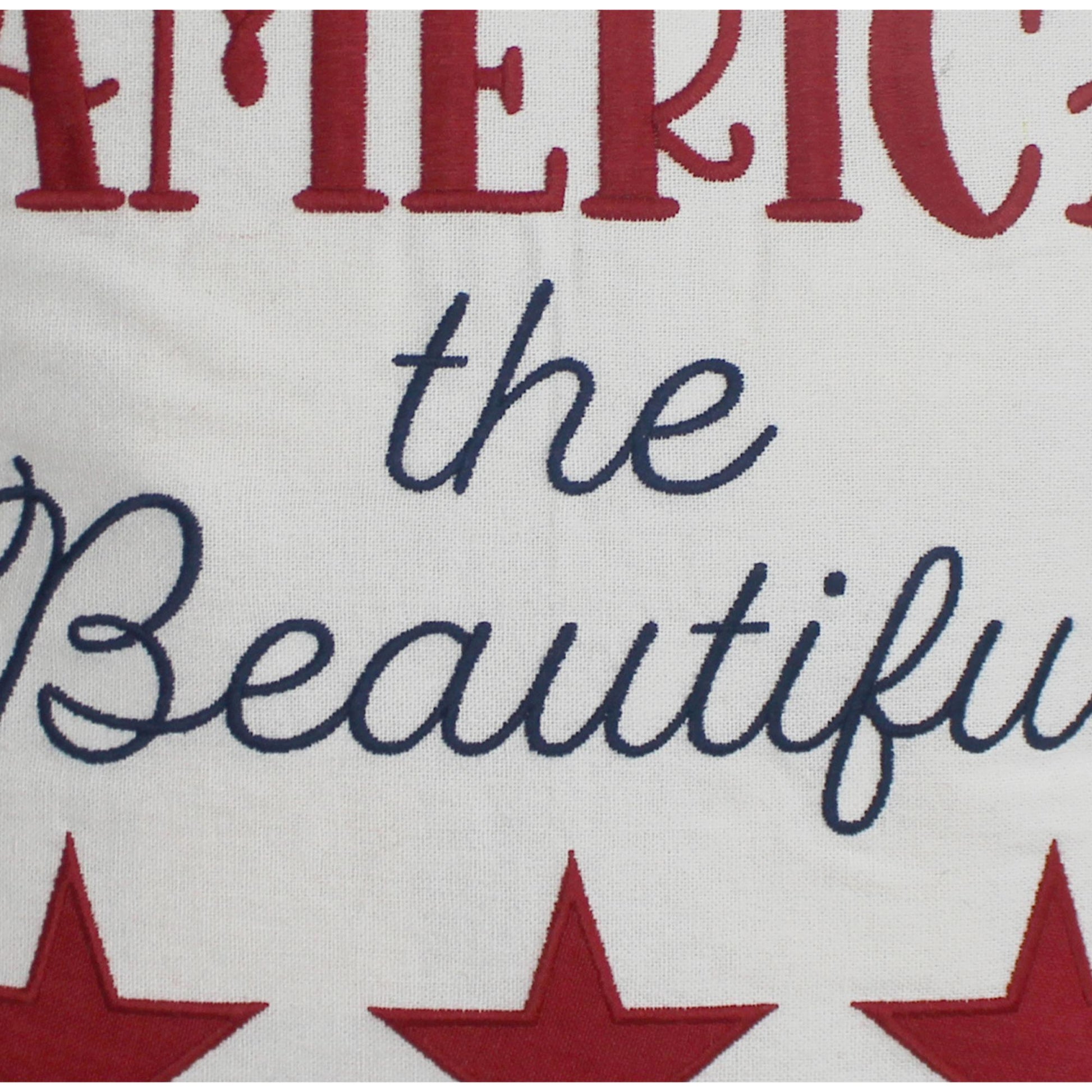 Introducing the "America the Beautiful" Pillow, a charming addition to your home decor that celebrates the spirit of patriotism. Measuring 14"x14", this pillow is perfectly sized to add a touch of Americana to any room. Crafted from everyday cotton, it offers both comfort and durability, making it ideal for daily use. The vibrant embroidery in red, white, and blue showcases a timeless patriotic design, perfect for national holidays or year-round display. Whether placed on a sofa, chair, or bed, this pillow is sure to evoke a sense of pride and nostalgia. Embrace the beauty of the nation with this delightful and meaningful accent piece.