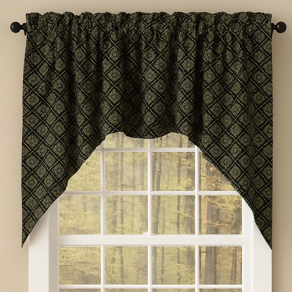 Introducing the Swag 72 In x 36 In Kingston Jacquard Swag, a perfect blend of elegance and rustic charm for your home decor. This set of two swags features a sophisticated jacquard weave in a timeless black hue, complemented by a nutmeg primitive country design that adds warmth and character to any room. Crafted with meticulous attention to detail, the high-quality fabric ensures durability and a luxurious drape, making it an ideal choice for everyday use. The versatile design effortlessly enhances both traditional and contemporary interiors, providing a stylish window treatment that exudes comfort and sophistication. Easy to install and maintain, these swags are perfect for adding a touch of refined country elegance to your living space. Transform your windows with the Kingston Jacquard Swag and enjoy the perfect balance of style and functionality. Product is lined and has a rod pocket 2.5 In wide. Dry clean only.