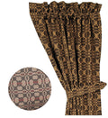 Introducing the Gathered Swag 72" x 63" Kendall Jacquard, a perfect blend of elegance and rustic charm for your home decor. This set includes two beautifully crafted swags, each designed to add a touch of sophistication to any room. The intricate jacquard pattern in a striking black, red, and oat color palette brings a warm, primitive, and country-inspired aesthetic to your windows. Made from high-quality materials, these swags are not only visually appealing but also durable and easy to maintain. Whether you're looking to enhance your living room, bedroom, or kitchen, the Kendall Jacquard Gathered Swag is an ideal choice for everyday elegance. Transform your space with this timeless design that effortlessly complements a variety of interior styles. Dry Clean only. Has a rod pocket 2.5" and is lined.