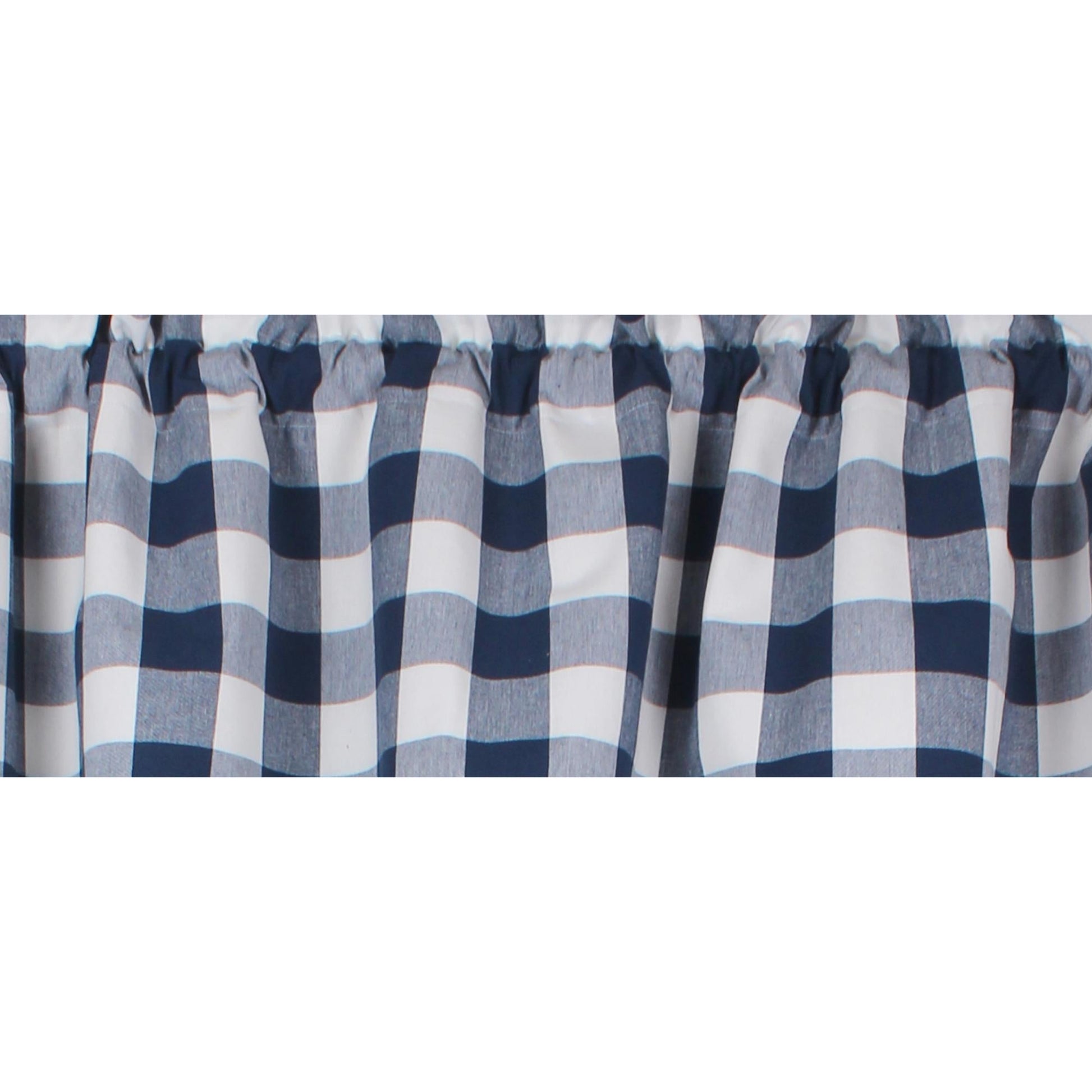 Add a touch of rustic charm to your home with the Buffalo Check Navy Blue Valance. Measuring 72 In x 15.5 In, this valance is crafted from everyday cotton, ensuring both durability and a soft, inviting texture. The classic navy blue buffalo check pattern effortlessly complements a farmhouse aesthetic, bringing warmth and style to any room. Perfect for kitchens, living rooms, or bedrooms, this valance provides a subtle yet stylish window treatment that enhances natural light while offering a hint of privacy. Easy to install and maintain, it’???s an ideal choice for those looking to refresh their home decor with a timeless, cozy look. Transform your space with this versatile and charming valance that embodies the essence of country living. Product is lined and has a rod pocket 2.5 In wide. Dry clean only.