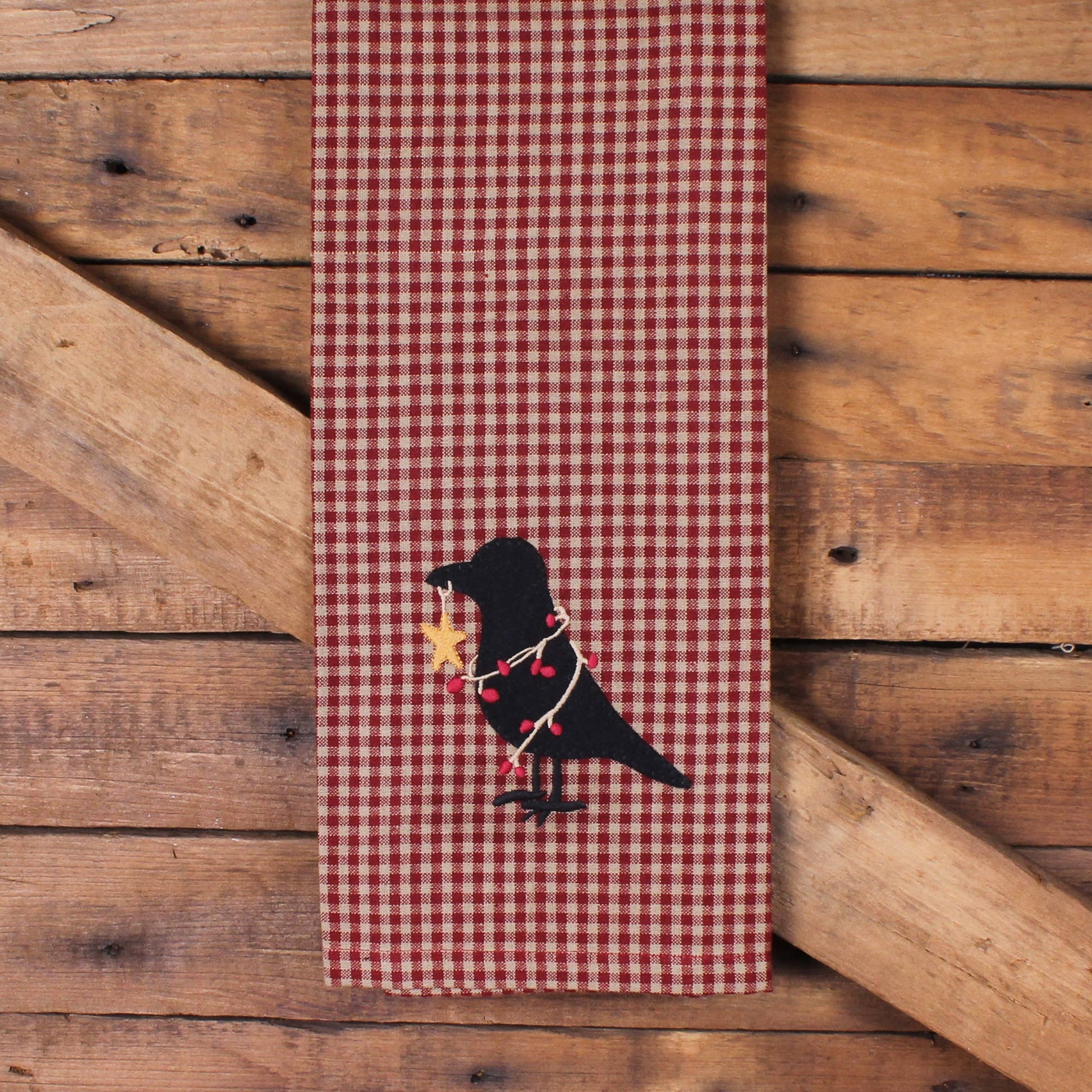 - Features Newbury Gingham Barn Red towel with applique and embroidered crow design
