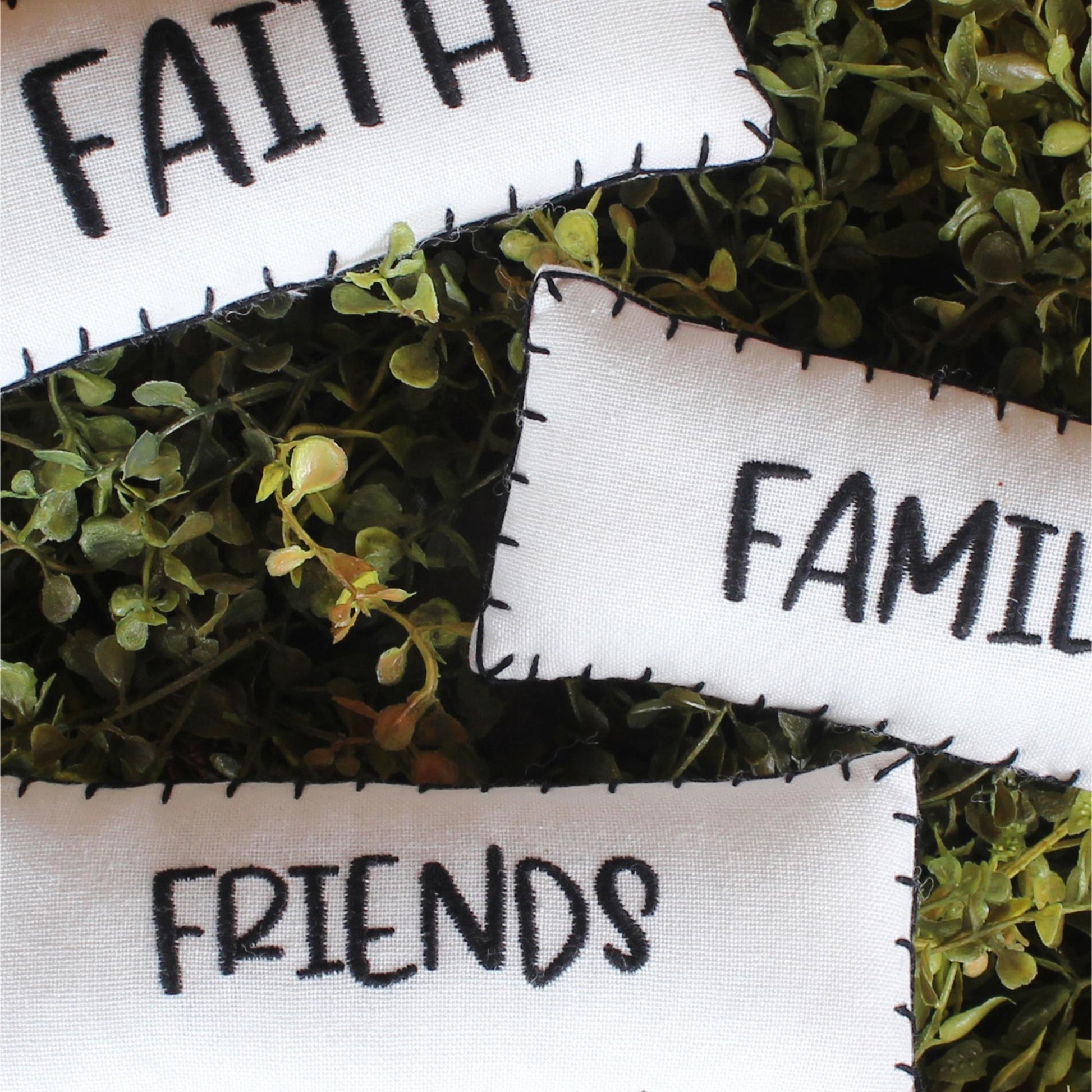 Enhance your living space with this charming set of three home accents, each measuring 4"x1.75". Crafted from everyday cotton, these pieces feature elegant embroidery in classic white and black, perfectly embodying the timeless appeal of farmhouse and country decor. The set includes the heartfelt words "Faith," "Family," and "Friends," serving as a daily reminder of the values that truly matter. Whether displayed on a mantel, shelf, or tabletop, these accents add a touch of warmth and inspiration to any room. Their versatile design effortlessly complements a variety of interior styles, making them a delightful addition to your home or a thoughtful gift for loved ones.