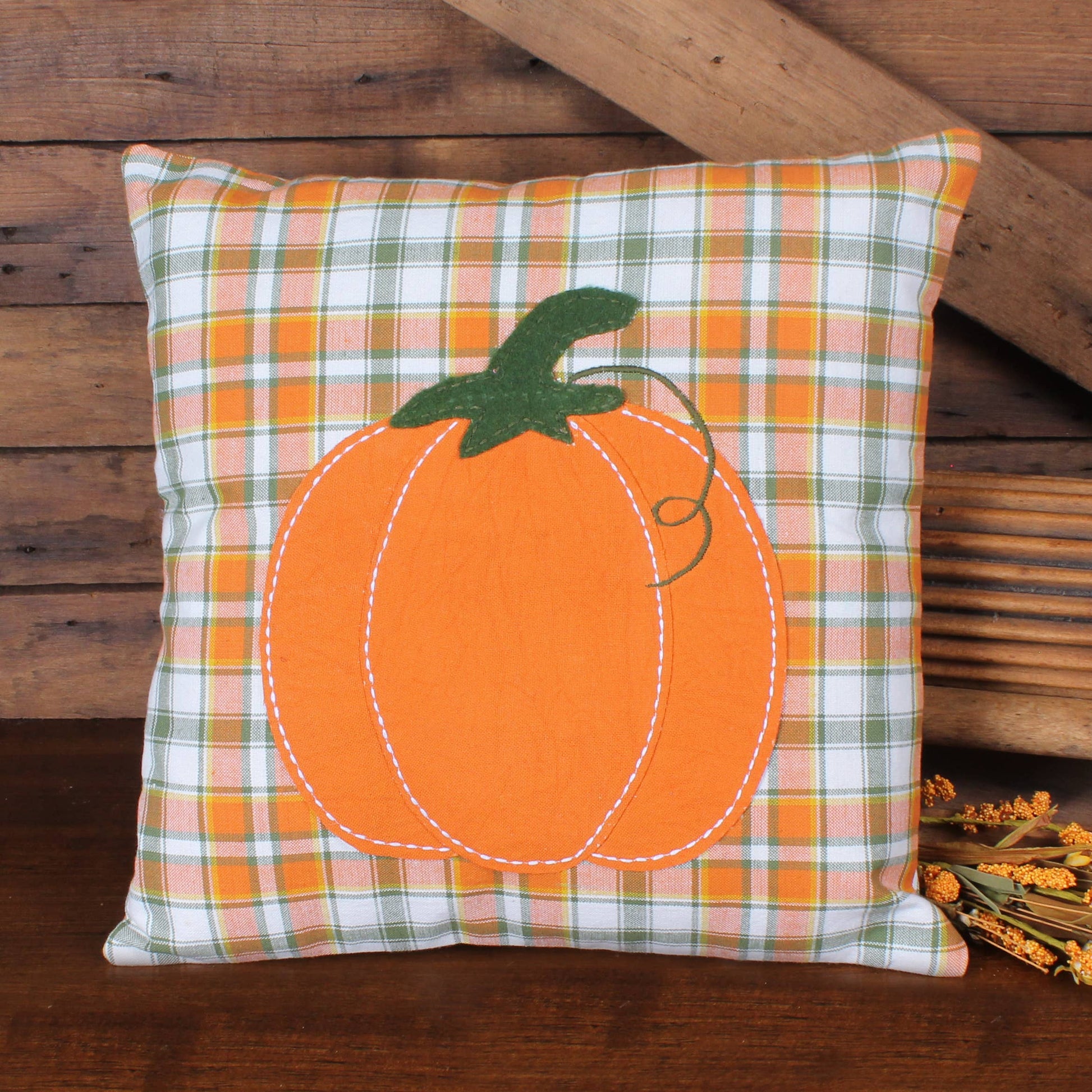 The Fall Harvest Pumpkin Pillow is a charming new addition to the popular Fall Harvest collection, featuring a cheerful plaid combining shades of orange, sage, and yellow on an off white ground with a classic pumpkin appliqué. Great for decorating or gifting, this pillow adds the perfect touch of autumn charm. It ships filled and ready for use—just fluff and enjoy.