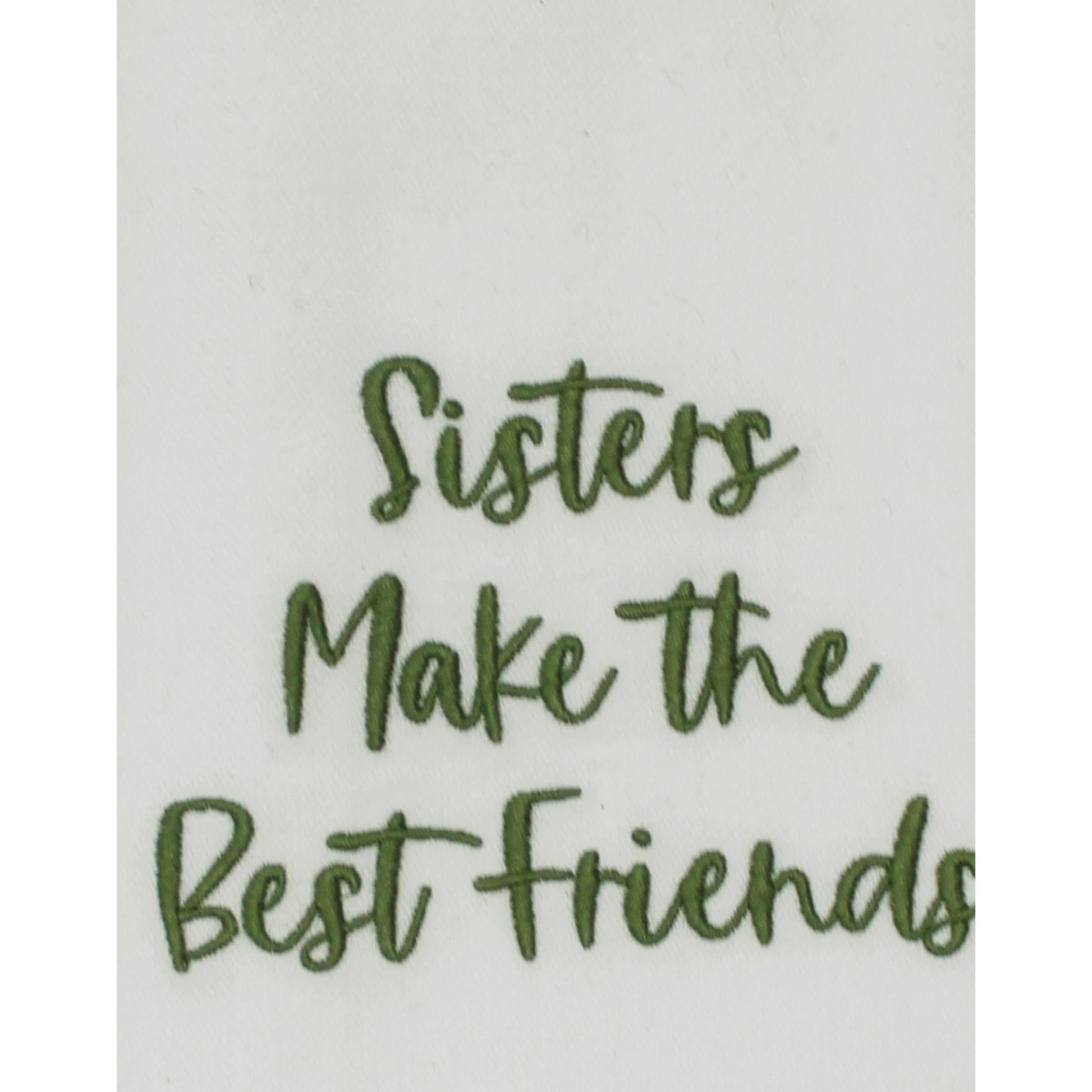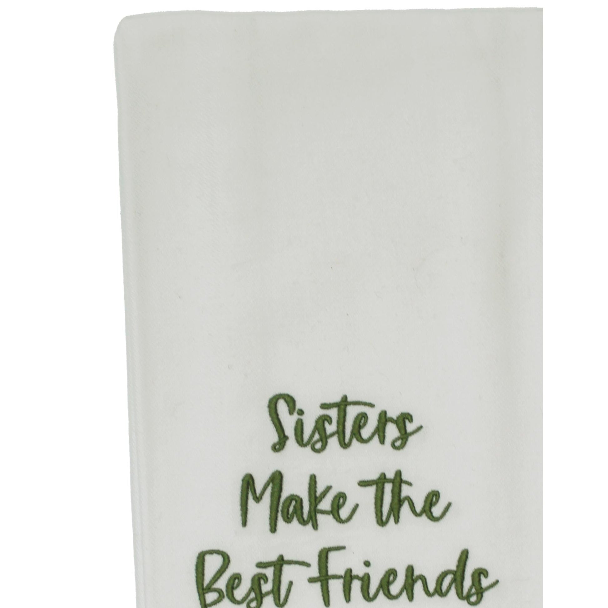 Introducing the "Sisters Make Best Friends" Towel, a charming addition to your home that celebrates the special bond between sisters. Measuring 18"x28", this towel is crafted from everyday cotton, ensuring both durability and softness for daily use. The vibrant green hue is complemented by an elegant embroidered design, featuring a lush green garden motif that adds a touch of nature-inspired beauty to your kitchen or bathroom. Perfect for drying dishes or hands, this towel combines practicality with a heartfelt message, making it an ideal gift for your beloved sister. Whether for a special occasion or just because, this towel is a delightful reminder of the cherished friendship shared between sisters. Embrace the warmth and love of sisterhood with this beautifully designed, functional piece.