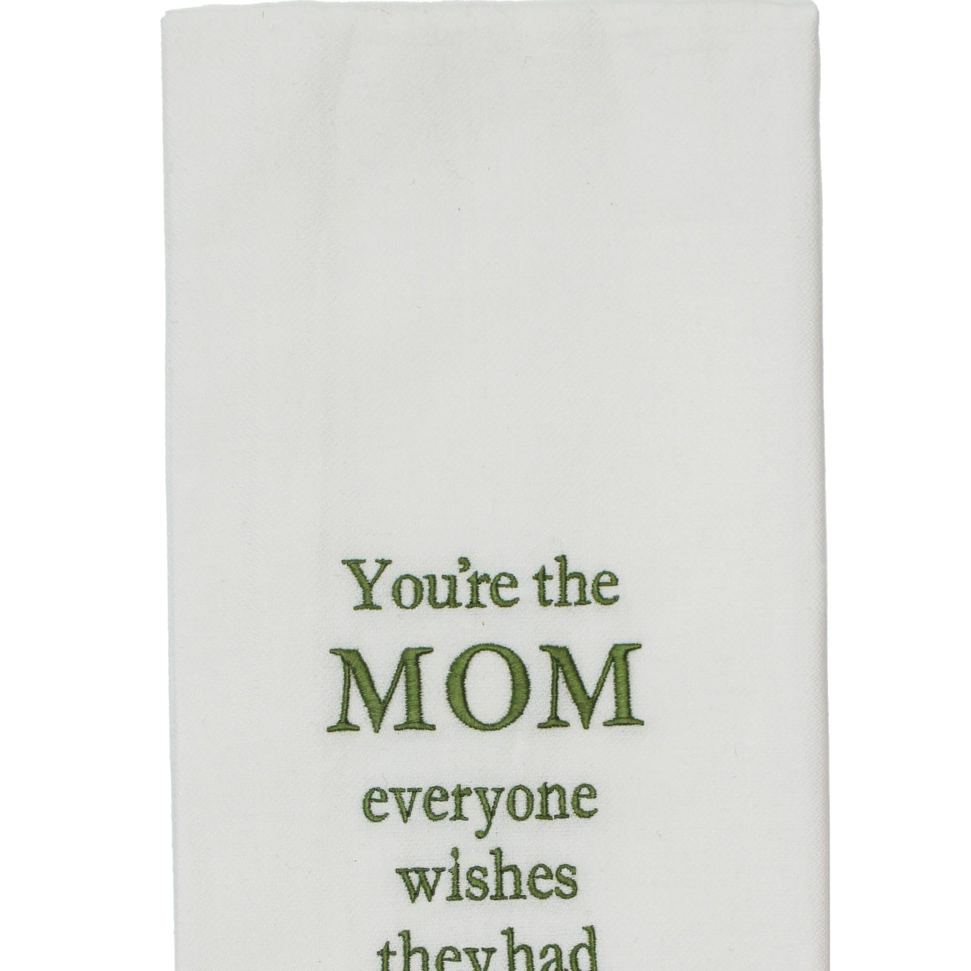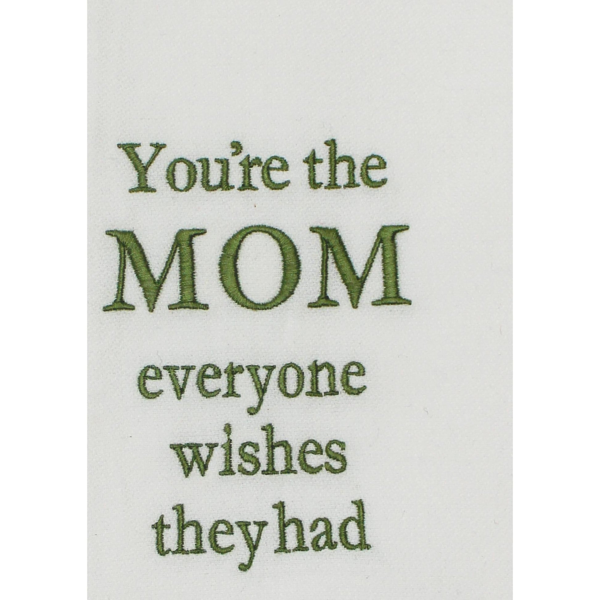 Introducing the "You're the Mom" Towel, a delightful addition to your everyday essentials. Measuring 18"x28", this towel is crafted from high-quality cotton, ensuring softness and durability for daily use. Its vibrant green hue is complemented by an elegant embroidered design, featuring a charming garden motif that adds a touch of nature to your kitchen or bathroom decor. Perfect for gifting or personal use, this towel celebrates the nurturing spirit of motherhood with its thoughtful message. Whether you're drying dishes or hands, this towel combines functionality with a heartfelt sentiment, making it a must-have for any home. Embrace the warmth and care of "You're the Mom" with this beautifully designed towel.
