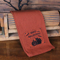- Features detailed applique and embroidered design on pumpkin spice ticking towel