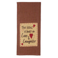The Home Built Love & Laughter Kitchen Towel 18 in x 28 In adds a heartfelt and rustic charm to your everyday kitchen routine. Made from high-quality cotton with intricate embroidery, its barn red and nutmeg hues evoke the warmth and simplicity of a primitive, country-style home. Featuring the inspiring phrase InHome Built Love & Laughter, In this towel is both a functional kitchen essential and a decorative statement piece. Durable enough for daily use, it is perfect for drying dishes, handling spills, or simply adding a cozy touch to your kitchen d?cor. Its timeless design makes it a thoughtful gift or a meaningful addition to your own space. Celebrate the heart of your home with this beautifully crafted and practical kitchen accessory.