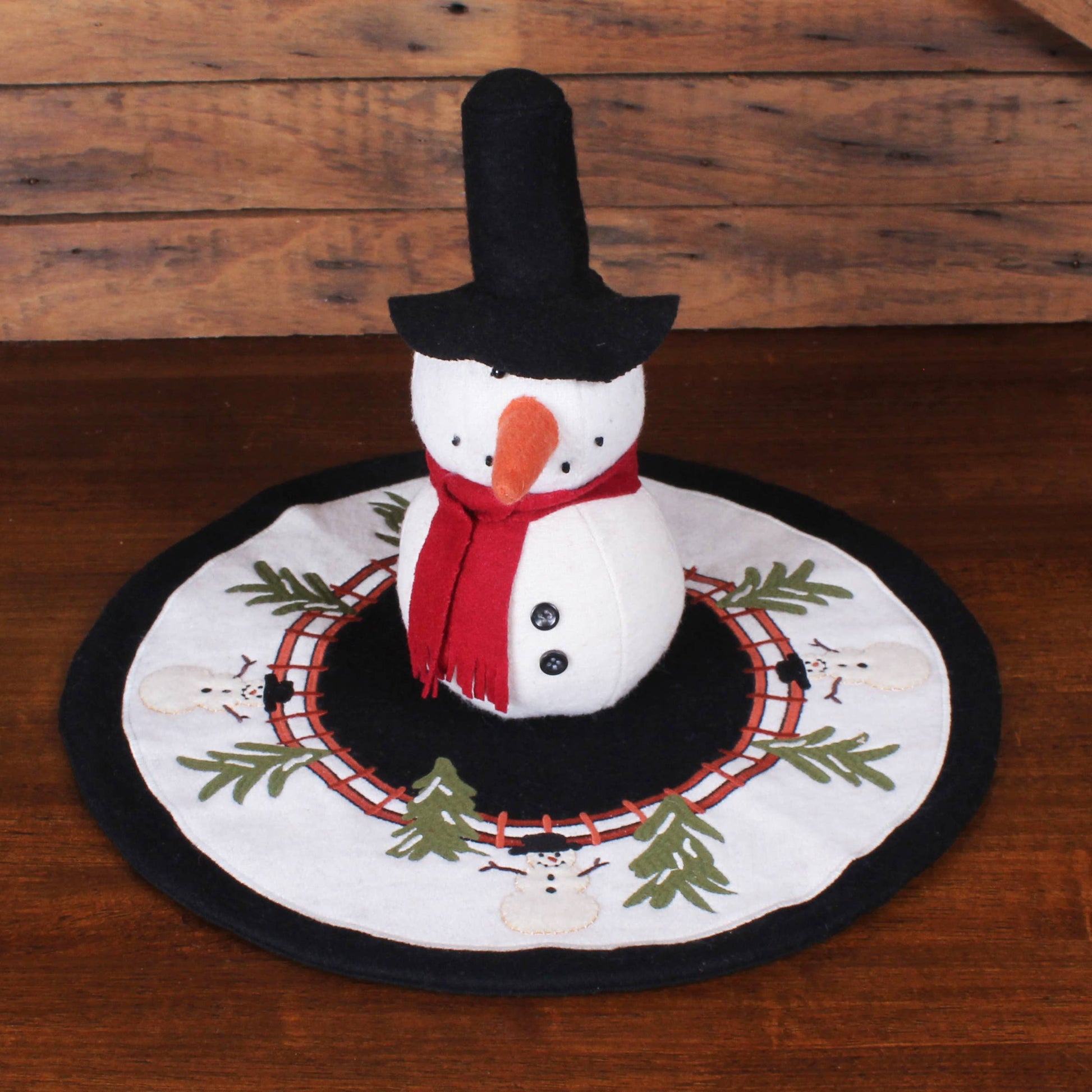 - Features applique with embroidery snowmen in a tree filled field of snow