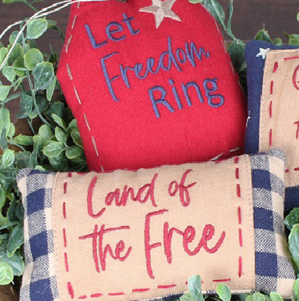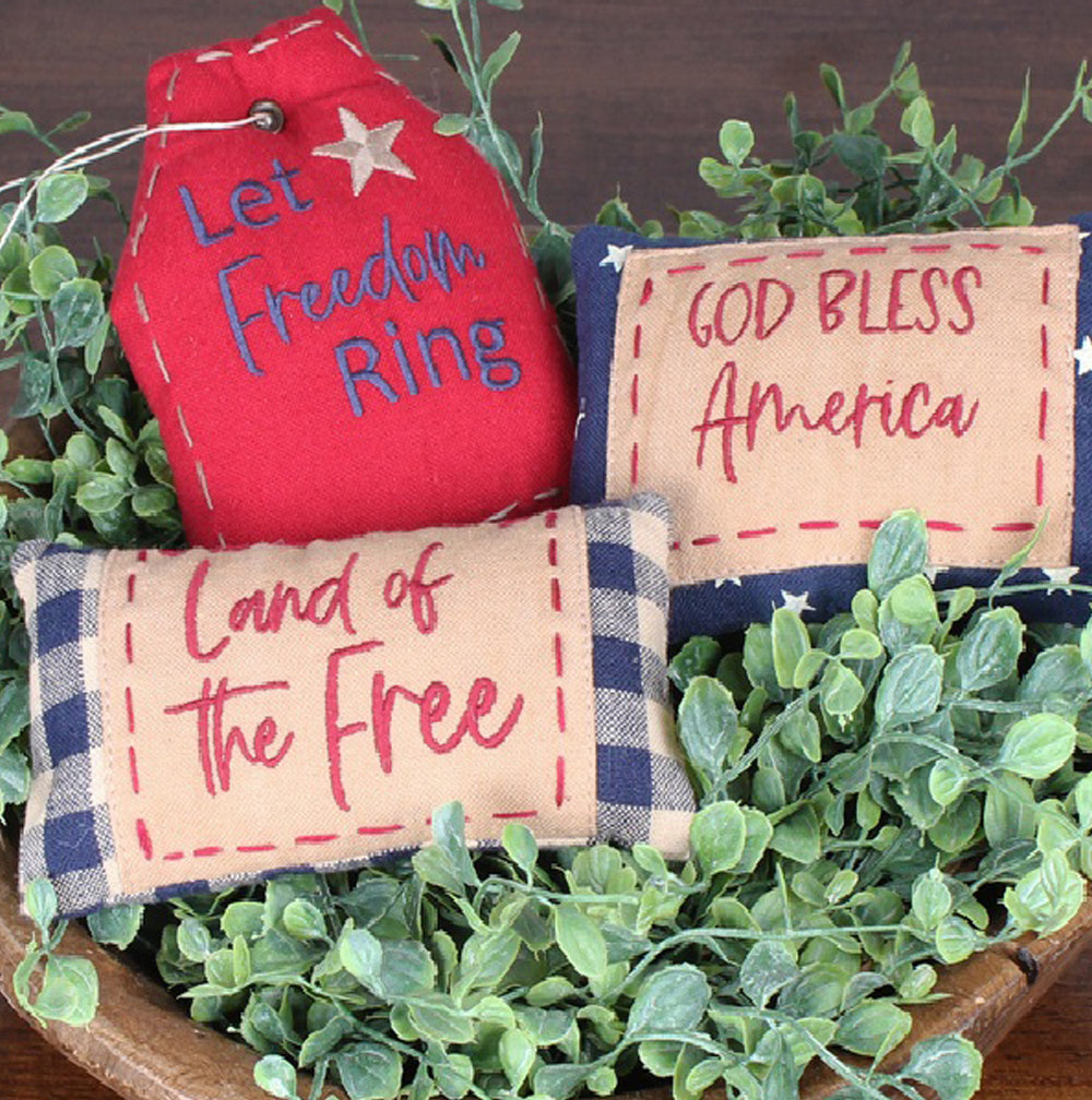 Introducing the Liberty Fill Set of 3 Home Accents, a charming trio designed to infuse your space with a touch of patriotic elegance. Crafted from high-quality cotton, these decorative pieces come in three versatile sizes: 5"x3", 5.5"x2.5", and 4"x5", making them perfect for a variety of display options. Each piece features a vibrant, multi-colored design that celebrates the spirit of liberty and freedom, ideal for everyday decor or special occasions. Whether placed on a mantel, shelf, or tabletop, these accents add a warm and inviting atmosphere to any room. Their durable construction ensures they remain a staple in your home decor collection for years to come. Celebrate your love for country and style with this delightful set that effortlessly blends tradition with contemporary charm.
