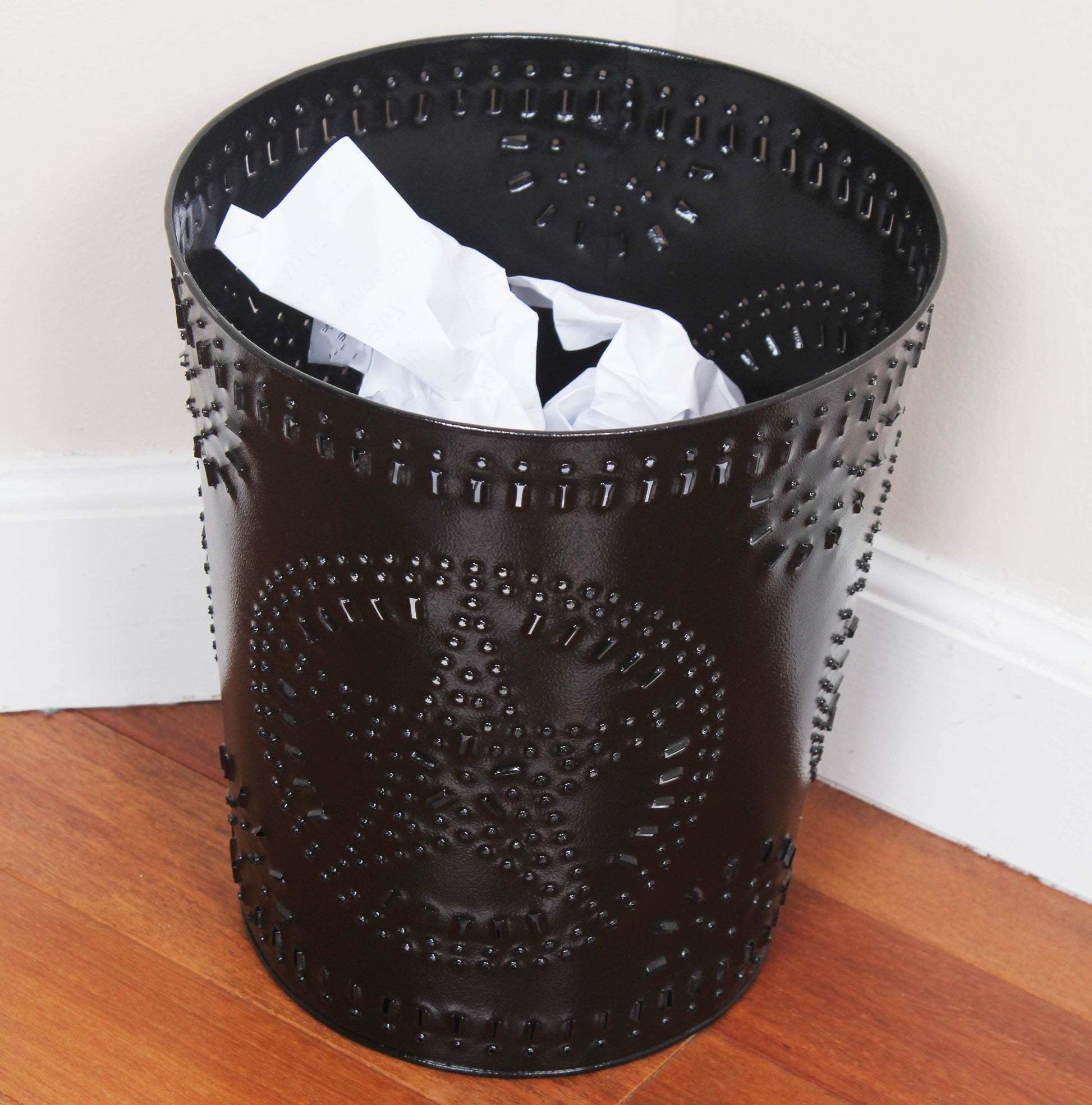 The Metal Punched Waste Basket is the perfect solution for small baths, offices, guest rooms. Measuring 10 1/4 In and 9 1/4 In Diameter with a black finish and star punched details is perfect for small spaces.