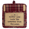 The InNothin' Says Lovin' Pocket Potholder Set 9 in x 9 In In is a charming addition to your kitchen for everyday use. Made of high-quality cotton, these potholders feature a beautiful embroidered design that captures the warmth and love of home cooking. The set is available in a rich color combination of barn red, black, and tan, perfect for enhancing any farmhouse or country-style kitchen. The pocket design offers extra convenience, allowing you to easily handle hot pots and pans with ease and comfort. With its durable construction and cozy design, this potholder set is both practical and a great way to add a personal touch to your kitchen decor. Ideal for gifting or adding a bit of love to your own home, these potholders will quickly become your go-to kitchen accessory.