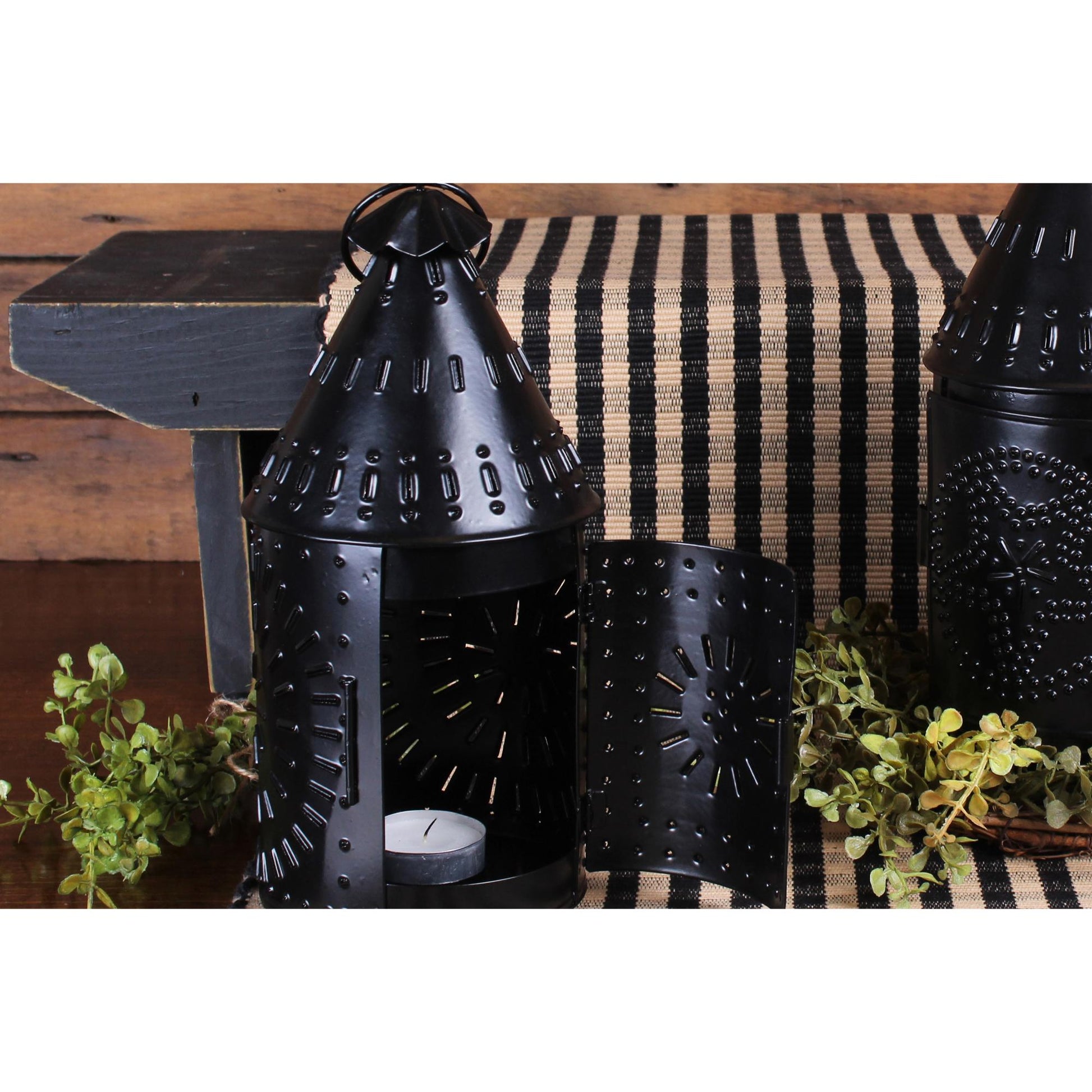 Illuminate your space with the rustic charm of the Metal 9"x14" Punched Lantern. Crafted from durable iron, this lantern features a classic black finish that effortlessly complements any country or primitive decor. Its intricate punched design casts enchanting patterns of light and shadow, creating a warm and inviting ambiance in any room. Measuring 9 inches in height and 4 inches in width, it's the perfect size for tabletops, mantels, or hanging displays. Whether used indoors or outdoors, this versatile lantern adds a touch of timeless elegance to everyday settings. Ideal for those who appreciate the blend of traditional craftsmanship and modern functionality, this lantern is a must-have for creating cozy, atmospheric lighting.