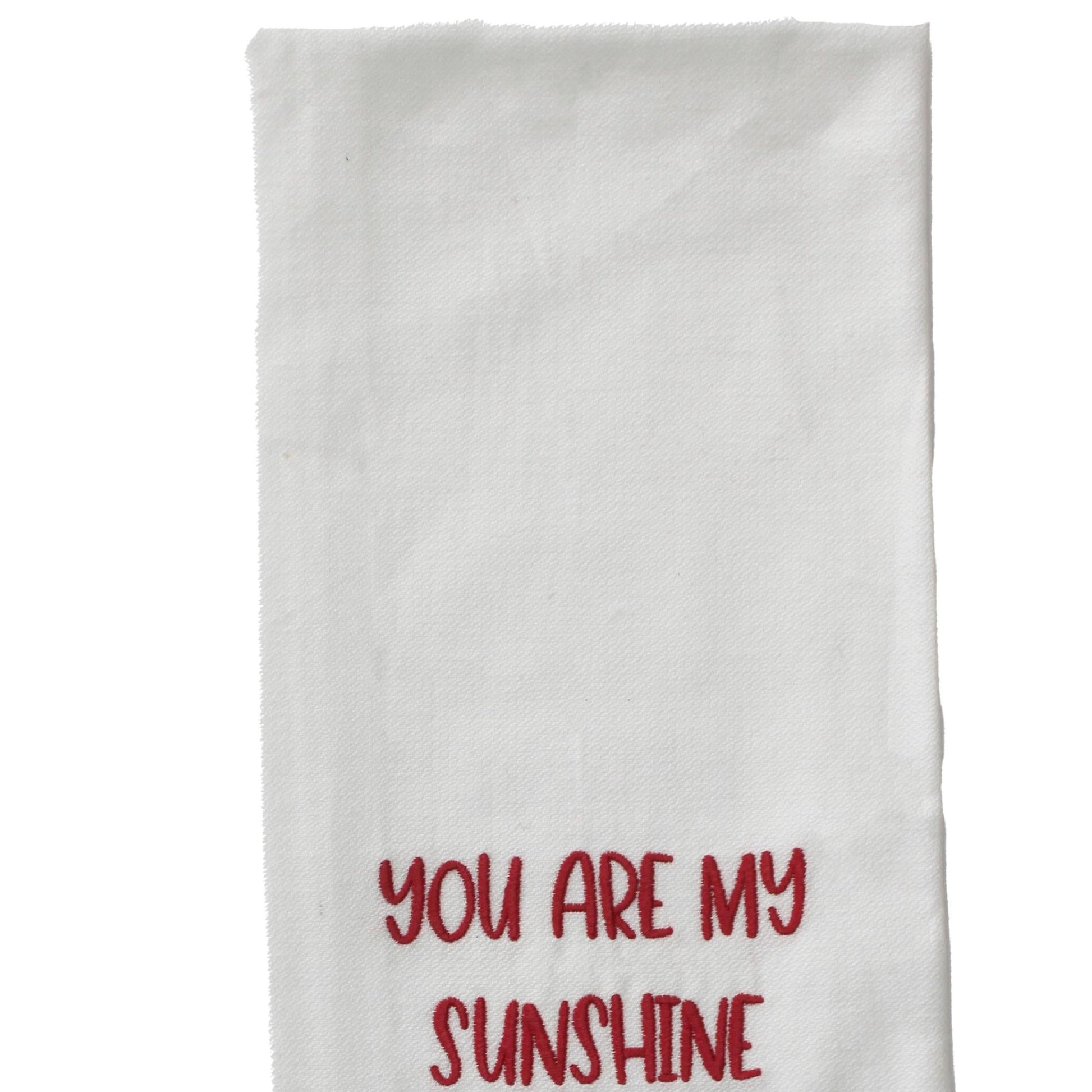 Introducing our charming "You are my Sunshine" Towel, a delightful addition to any kitchen or bathroom. Measuring 18"x28", this towel is crafted from everyday cotton, ensuring both durability and softness for daily use. The vibrant red hue is beautifully complemented by the embroidered message, adding a touch of warmth and positivity to your space. Its farmhouse and country-inspired design makes it a perfect fit for rustic or cozy home decor styles. Whether you're drying dishes or hands, this towel brings a cheerful and inviting atmosphere to your home. Elevate your everyday routine with this lovely and functional accessory.