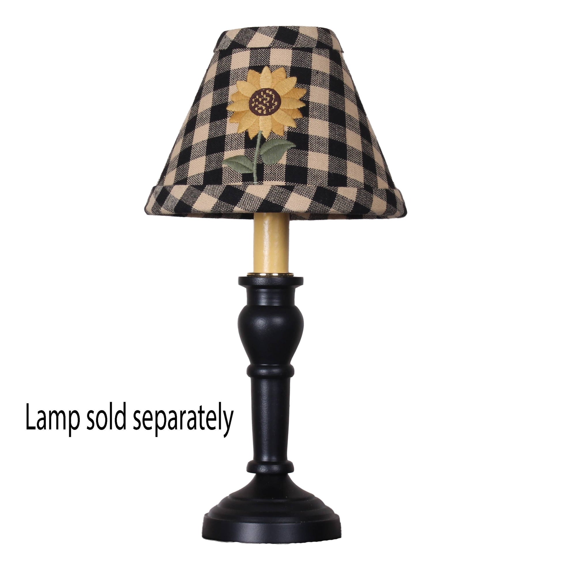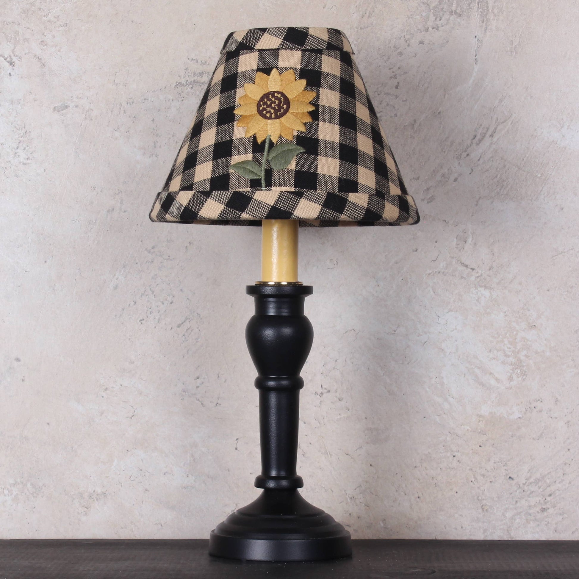 Our new Sunflower 6 In shade features an enduring sunflower applique and embroidered design on our popular Heritage House Black Check. Whether you're aiming for a cozy rustic vibe or a classic country aesthetic, this lampshade effortlessly adds charm to your decor. Part of our new decorative 6 In shade collection, shade was designed for our popular Wellington Spindle Candle lamps (sold separately).